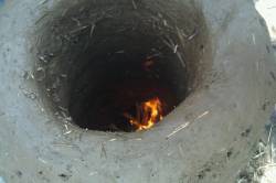 We will then fire it with charcoal and over the next few hours we will add ore (magnetite) and charcoal until we believe we have a sufficient iron "bloom" in the bottom of the furnace. Then we will open it and commence to consolidate the bloom into a 'muck bar' and possibly continue on to wrought iron if time/energy/interest allows.