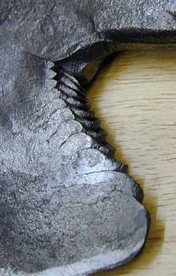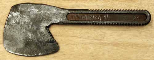 | When I started, I had in mind to make a cook's cleaver. Soon after I began forging I realised that the 'handle' was too long and it would be an awkward kitchen tool at best. I toyed briefly with the idea of trying to pull the bottom corner down enough to make it a 'bearded' cleaver, but the steel spoke and said that it was going to be a hatchet thankyou very much, and if I tried to turn it into anything else it was just going to be ugly. Sometimes Brute Force & Ignorance don't win, sometimes you have to listen. |